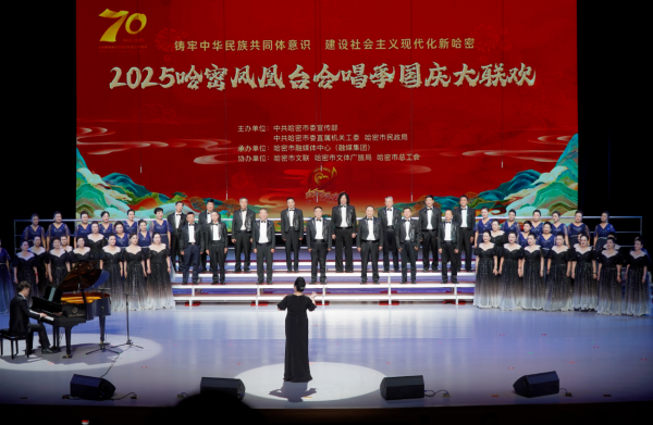9月29日,2025哈密凤凰台合唱季国庆大联欢在哈密市文化馆举行。演出剧场内,《今天是你的生日,中国》《我们新疆好地方》等13首风格各异的作品精彩上演,活动尾声更是以一首《歌唱祖国》将现场氛围推向高潮。凤凰台合唱季国庆大联欢以音乐为纽带,集结多支优秀合唱团队,尽显哈密蓬勃的文化活力与深厚的艺术底蕴。