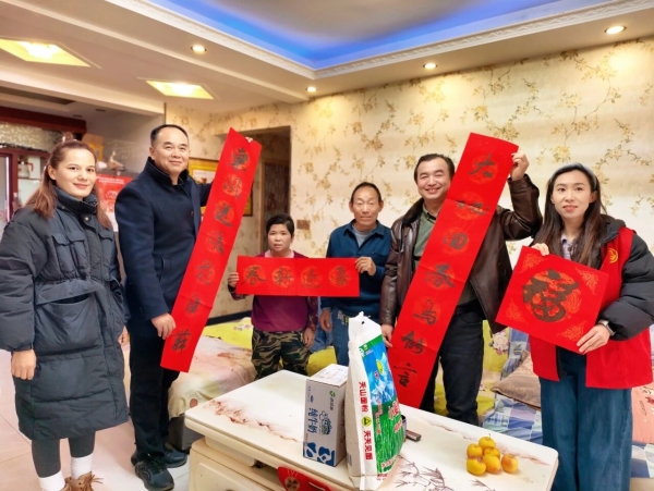 慰问中,市文联干部与居民群众亲切交流,宣讲党的二十届四中全会及市委二届八次全会精神,询问了解家庭生活、健康状况与实际困难,鼓励大家坚定信心、欢度佳节。由吐鲁番市书法家精心书写的春联与福字,墨香浓郁、寓意吉祥,增添了浓厚的年味儿。