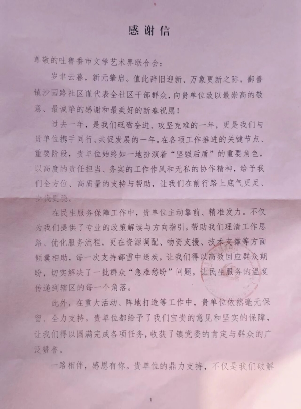沙园路社区主任李杰代表社区向市文联致送感谢信,对文联一年来在结对共建、积分管理、文化惠民、帮扶解困等方面的扎实支持与真情付出表示衷心感谢。
