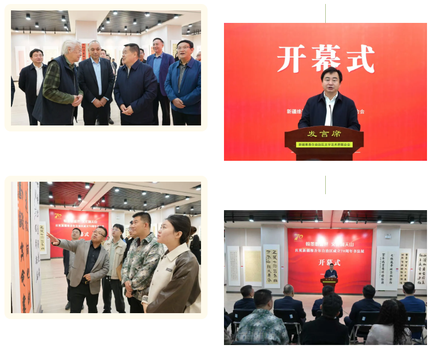 汪泽致辞并宣布展览开幕。他表示,习近平总书记率中央代表团出席新疆维吾尔自治区成立70周年庆祝活动,新疆文艺界备受鼓舞,满怀喜悦,广大文艺工作者将以更加昂扬向上的精神风貌,建设美丽新疆。书法艺术作为中华优秀传统文化的瑰宝,在增强文化认同、促进民族团结方面发挥着不可替代的作用。本次展览不仅是向伟大祖国76周年华诞和自治区成立70周年的深情献礼,更是贯彻落实习近平文化思想,深入推进文化润疆,有形有感有效铸牢中华民族共同体意识的生动实践。