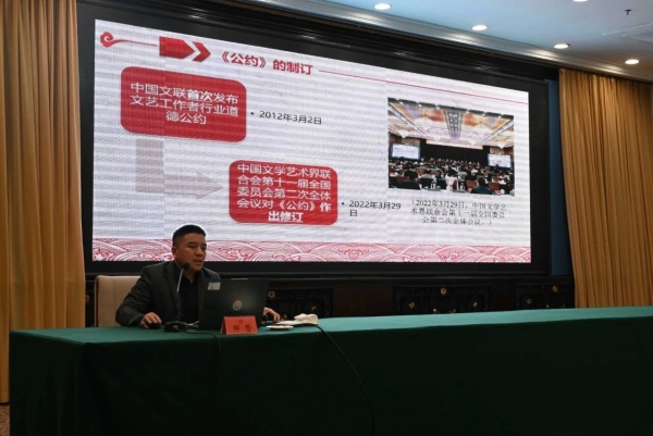 新疆文艺评论家协会主席、新疆大学中国语言文学学院二级教授、博士生导师邹赞作题为《立心铸魂德艺双馨——〈中国文艺工作者职业道德公约〉解读》的专题培训。从《中国文艺工作者职业道德公约》的出台背景、主要内容、“六个坚持”及文艺个案分析等方面,给大家作了内容详实、条理清晰的阐释。