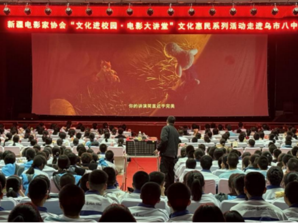 为深入学习贯彻习近平新时代中国特色社会主义思想,全面践行习近平文化思想,落实中国文联文化润疆协作机制,着力铸牢中华民族共同体意识,由新疆文联指导,新疆电影家协会主办的“文化进校园・电影大讲堂”文化惠民系列活动于2025年12月5日在乌鲁木齐市第八中学举行,共有700多名同学观看电影。