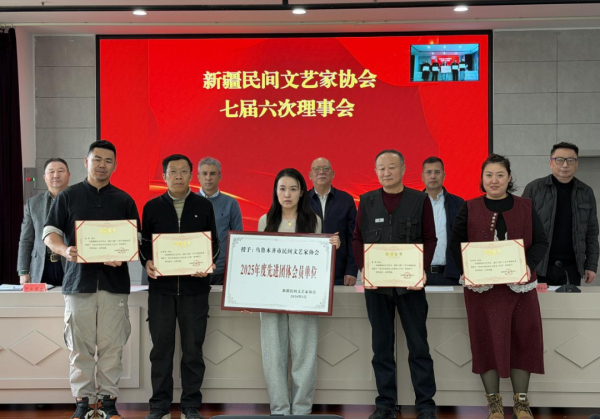 柳文喜现场宣读了新疆文联2025年度考核结果通报,以及《新疆民间文艺家协会关于表彰2025年度先进团体会员单位和优秀民间文艺工作者的决定》。为表彰先进、树立榜样,进一步激发全疆民间文艺工作者的创作与工作热情,经综合评选,对6个工作表现突出的新疆民协团体会员单位和10名民间文艺优秀工作者给予表彰,分别荣获“2025年度先进团体会员单位”“2025年度民间文艺优秀工作者”称号。柳文喜勉励获奖者珍惜荣誉、再创佳绩,号召全体理事以先进为标杆,凝心聚力推动新疆民间文艺事业再上新台阶。