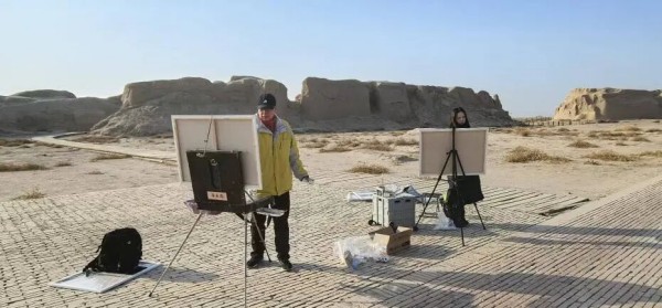 青年艺术家在高昌古城写生