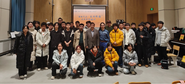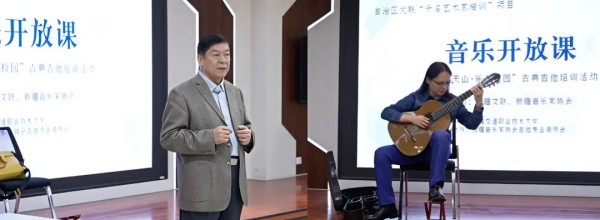 系列培训有序推进、顺利开展,新疆音乐家协会吉他专业委员会会长海萨尔・夏班拜作开场分享,从吉他历史文化、核心乐器特性、本土化发展历程三个维度,全面阐释新疆吉他音乐事业发展现状;新疆吉他演奏家张德润聚焦古典音乐发展脉络、时代意义及科学吉他学习方法开展专题授课,现场精彩演绎多首不同风格经典作品,与在场师生开展深度互动交流,充分彰显吉他艺术的独特魅力与感染力。二人曾长期深耕各大院校吉他艺术普及与推广工作,此番重返校园携手联合授课,一经启动便引发师生广泛关注与热烈反响。针对部分院校音乐专业师生扎实过硬的艺术功底,两位专家灵活优化授课模式,在做好基础知识点普及的前提下,专门增设专业技法讲解演示与现场即时答疑环节,让课堂兼具普及性与专业性,课堂氛围持续热烈浓厚,活动尾声全体师生合影留念,本次系列培训圆满落幕。
